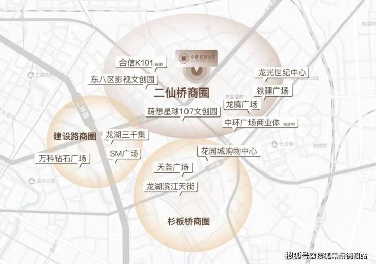 商业集群:合信K101(在建)、中环广场(在建)引领商业升级,龙腾广场、中国铁建广场、龙光世纪中心环伺周边