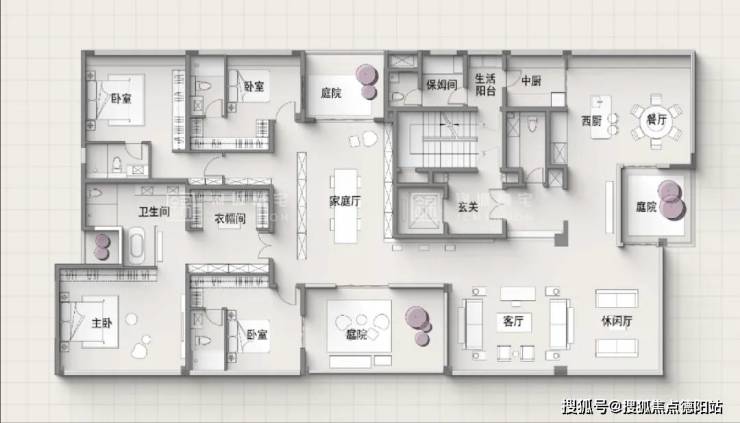 290㎡户型为2T2,同样是4.5房3厅5卫,每户设计了近20㎡的空中庭院,客厅、休闲厅、餐厅组合设计,超130㎡公区活动空间彰显豪宅尺度。